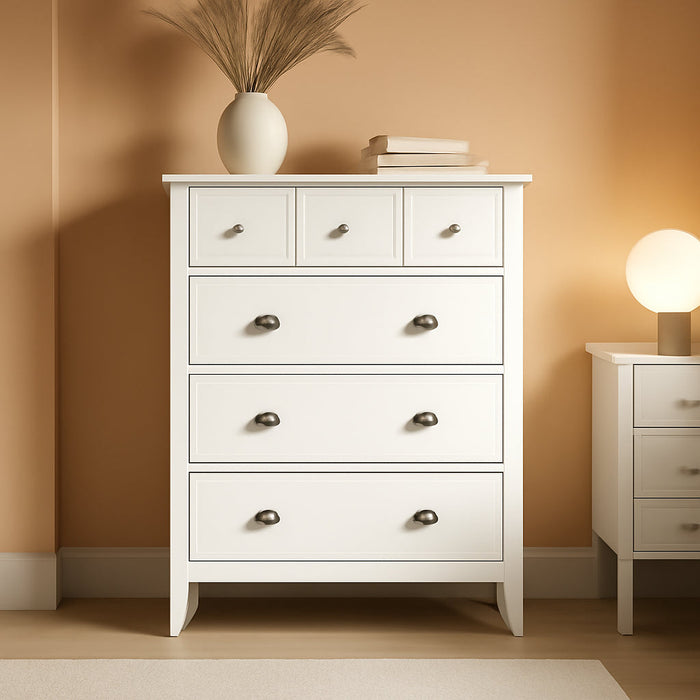 Designed for everyday use, this dresser offers four deep drawers that open and close on smooth metal runners with built-in safety stops. A patented T-lock assembly system keeps the chest solid and secure, while a Soft White finish with nickel hardware adds timeless appeal to any decor. This piece is Made in USA and safety-tested to keep your space child-friendly and stable.