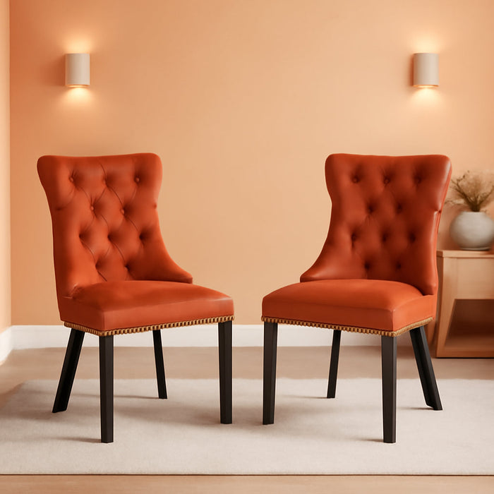 Set of 2 solid wood dining chairs in vibrant orange velvet, crafted to blend classic elegance with everyday comfort. The nailhead trim and curved back legs create a chic silhouette, while the thick cushions invite you to linger over meals.