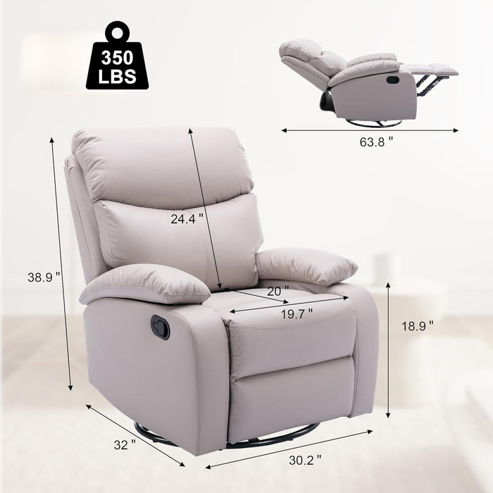 Compact comfort that unlocks full-body relaxation. The Cozy Swivel Rocker Recliner is designed for small spaces—apartments, nurseries, or RV interiors—delivering premium comfort in a clean, timeless beige PU leather finish.