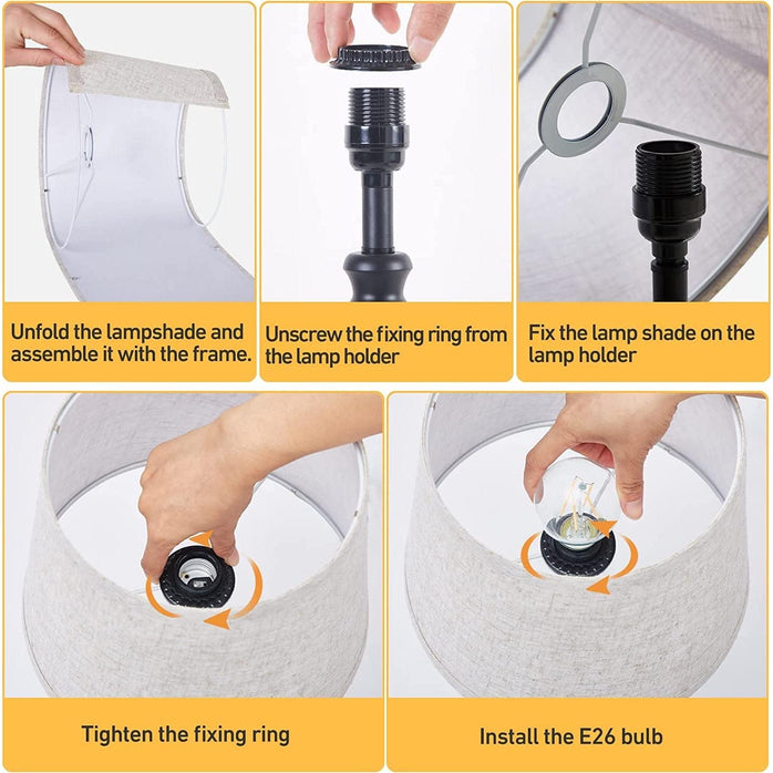 2 USB Fast Charging PortsTwo USB ports with a 5V/2.1A output allows you to fast charge your smartphones, tablets, power banks, kindle readers or any other usb powered devices with ease. | High-quality Design Home ImprovementOur dimmbale living room lamp sets designed with made-to-last exquisite linen lampshade, anti-rust metal finishing. We specially add some weight in the lamp base to avoid knocking the lamp off by children or pets. Standard E26 socket matches perfectly with the LED Edison bulb that comes with the package. | Free 2 LED Bulb IncludedFor your convenience, we offered two energy-saving LED bulbs for free, you don't need to buy bulbs separately. The energy-saving E26 LED Bulbs, giving off a stable and soft illumination for your home. 60W 2700K warm white light equivalent bulbs can help you save at least 90% energy bills in the daily. Moreover, no flickering light or buzzing prevents eye fatigue and provides a comfortable,stress-free atmosphere. |