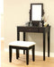 This complete 3-piece vanity collection blends a sleek vanity table, a comfortable stool, and a tilting mirror for a seamless beauty routine. The rich Espresso finish adds timeless elegance that complements a variety of decor styles.