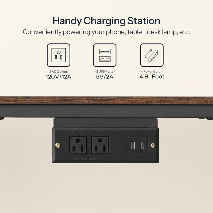 - Integrated charging center: 2 outlets and 2 USB ports with a repositionable power strip for flexible setup.