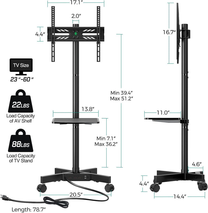 Mobile TV Cart With Height Adjustable Stand And Power Outlet For 23 To 60 Inch TVs