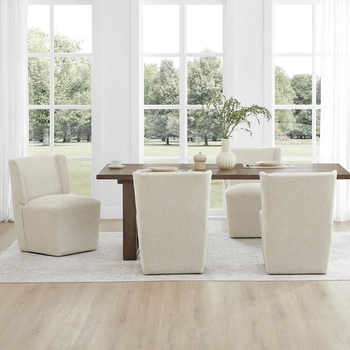 The contemporary wingback silhouette with an armless design offers supportive, relaxed seating that fits dining spaces, bedrooms, and living areas alike. Soft upholstery and a cushioned seat provide lasting comfort, while the hidden wheels deliver effortless reconfiguration for everyday living.