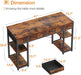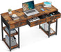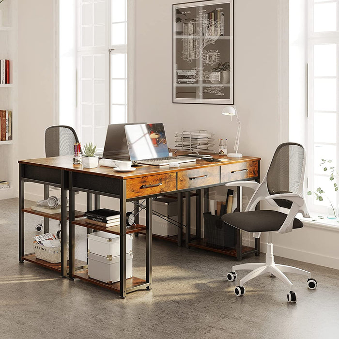 Designed as a 47-inch computer desk with storage, it provides a generous writing surface for a laptop, books, and peripherals while keeping essentials neatly tucked away in three fabric drawers.
