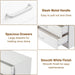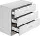 - Modern white finish with distinctive geometric detail and curved silver metal handles for a chic look.