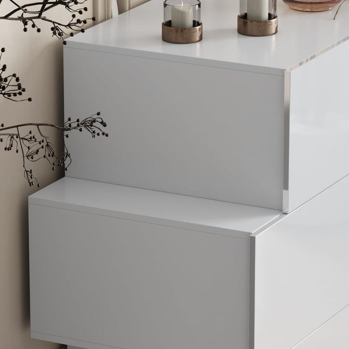 Built to last from sturdy MDF and quality hardware, this dresser offers a stable, durable foundation for everyday use. The smooth, waterproof surfaces are scratch-resistant for long-term beauty. The distinctive asymmetrical drawer arrangement adds a contemporary edge, while the top and side surfaces are not in high gloss for a tasteful contrast.