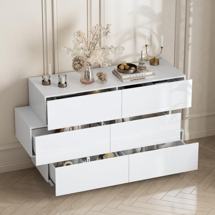 White High Gloss Six Drawer Dresser With Asymmetrical Design