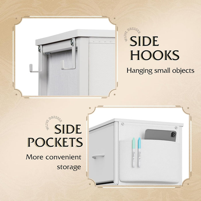 Built for durability and everyday use, it combines a sturdy steel frame with a MDF waterproof countertop and premium non-woven fabric drawers. The back is reinforced with tension bars for stability, and an anti-tilt device plus adjustable feet ensure safe, wobble-free placement on any floor.