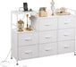 Power up your space with a warm, organized centerpiece. This white dresser TV stand combines a built-in charging station, open shelves, and eight fabric drawers with a durable wood top to keep your bedroom, living room, or hallway clutter-free and beautifully styled.
