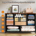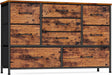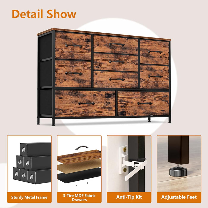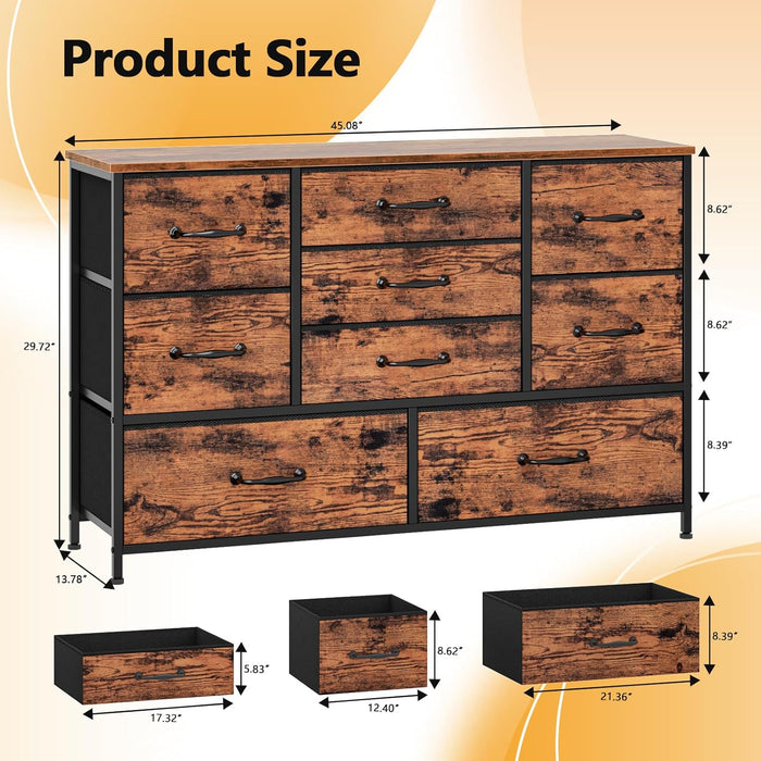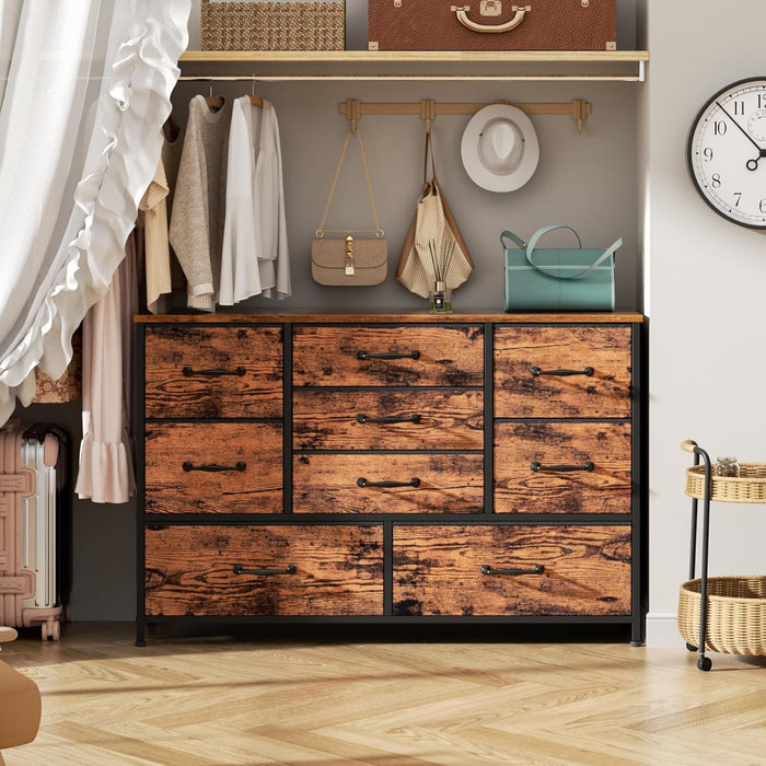 Built around a durable metal frame and a spacious wood tabletop, this 9-drawer dresser blends strength with style. The removable fabric drawers—made from polyester non-woven material with a wood-grain finish—keep items neatly tucked away and easy to grab.