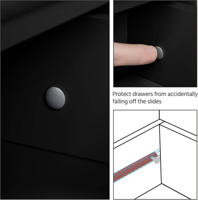 - Safety-first design includes plastic drawer stoppers and wall-mounting hardware for added stability.